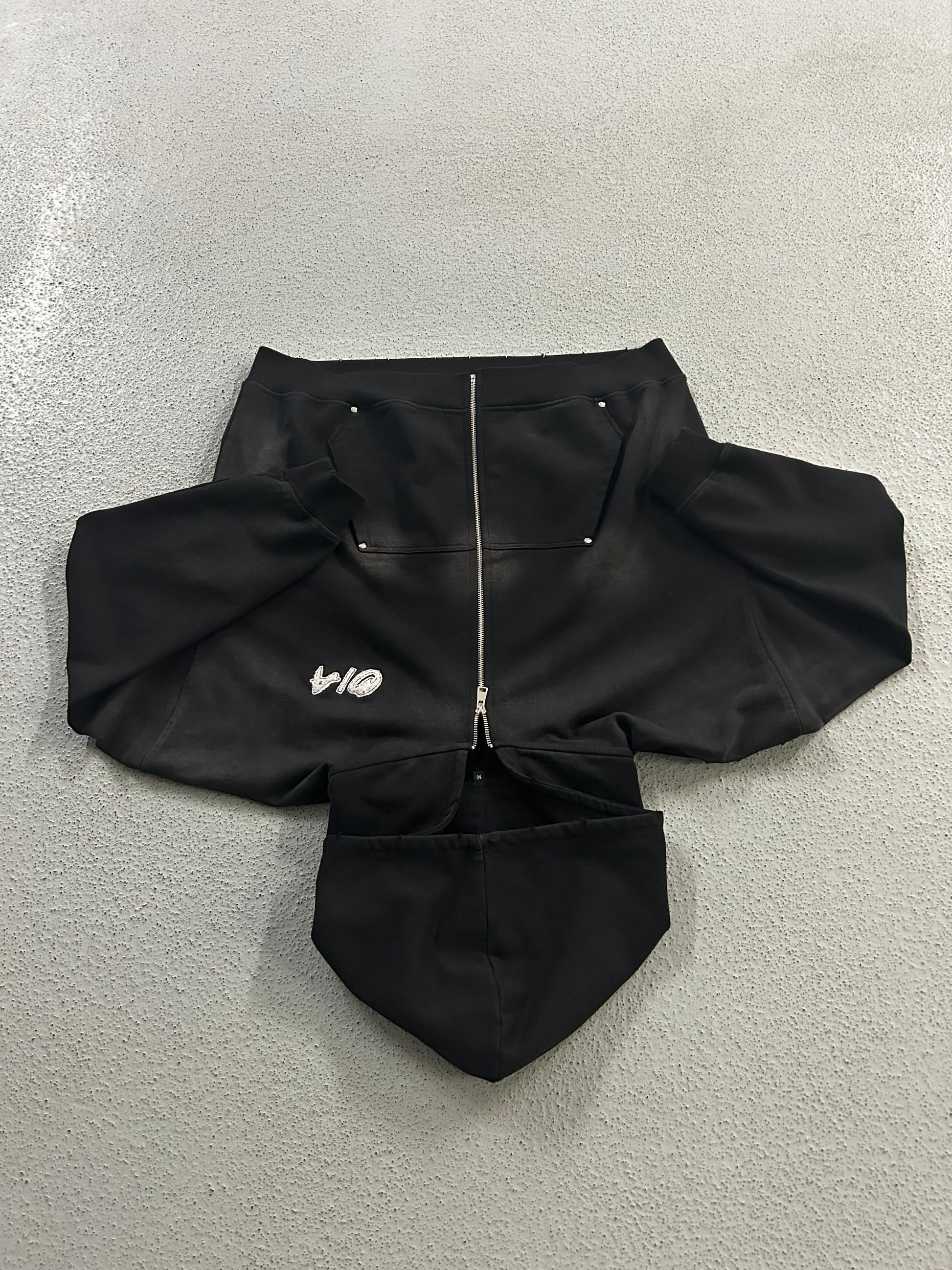 Distressing on hood, shoulders, cuffs, and waist